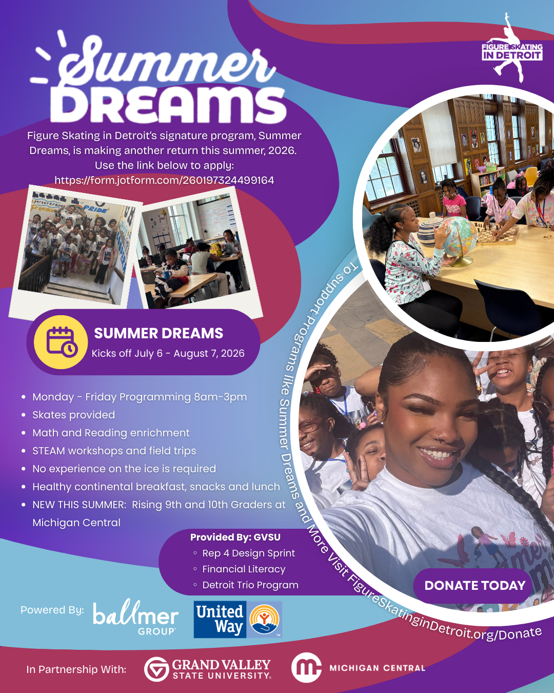 Figure Skating in Detroit in partnership with Grand Valley State University (GVSU) presents Summer Dreams 2026 at The School at Marygrove, (For rising grades 1-8) & Michigan Central (MC), (For Rising grades 9-10).